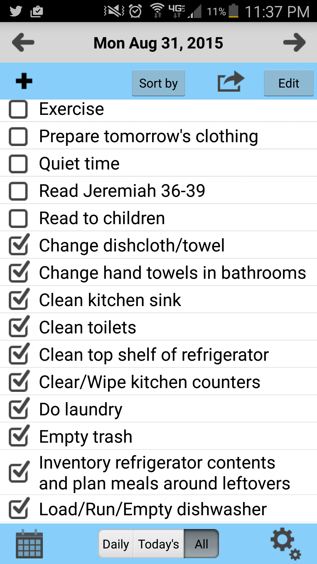 I’ve mentioned before that I love my Momo app to motivate me to clean regularly and clean the things I never would have thought to clean before. Today it’s serving another purpose of helping me see my messed up priorities. Zoya was lovely this evening, my husband was amazing, work was fine so I couldn’t figure out why I was feeling so blah until I checked to see what I’d done and left undone and noticed I’d done none of the things that bring life today. I hadn’t partaken in the Bread of Life. I hadn’t had any contemplative time to fellowship with Him and pour out my heart. I hadn’t even exercised enough to clear awat the thoughts of my work day. Sure, I have a very dust free house, but I have a very cluttered heart.