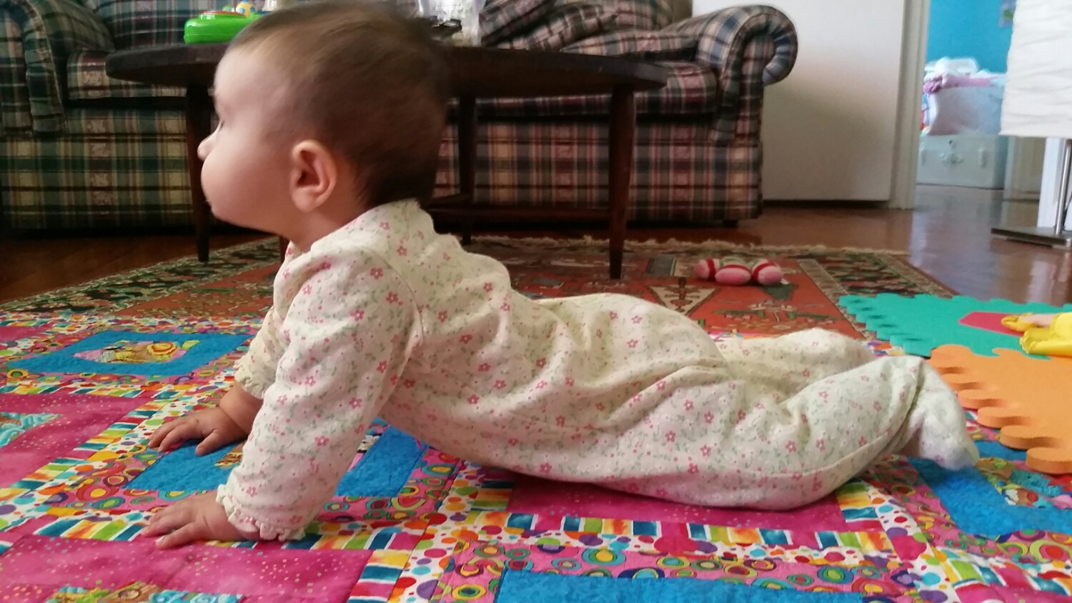 She really wants to crawl. She seems to have some innate sense that going up on her hands and knees will get her towards her goal, but she hasn’t figure out that she has to actually move them while she is up there.