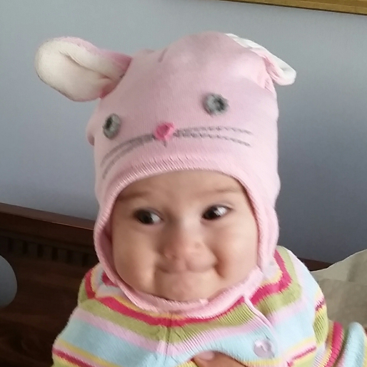 Sunday we got her an even warmer hat, and as soon as she saw herself in the mirror she actually smiled like a cat.