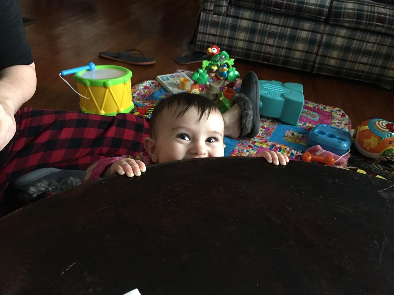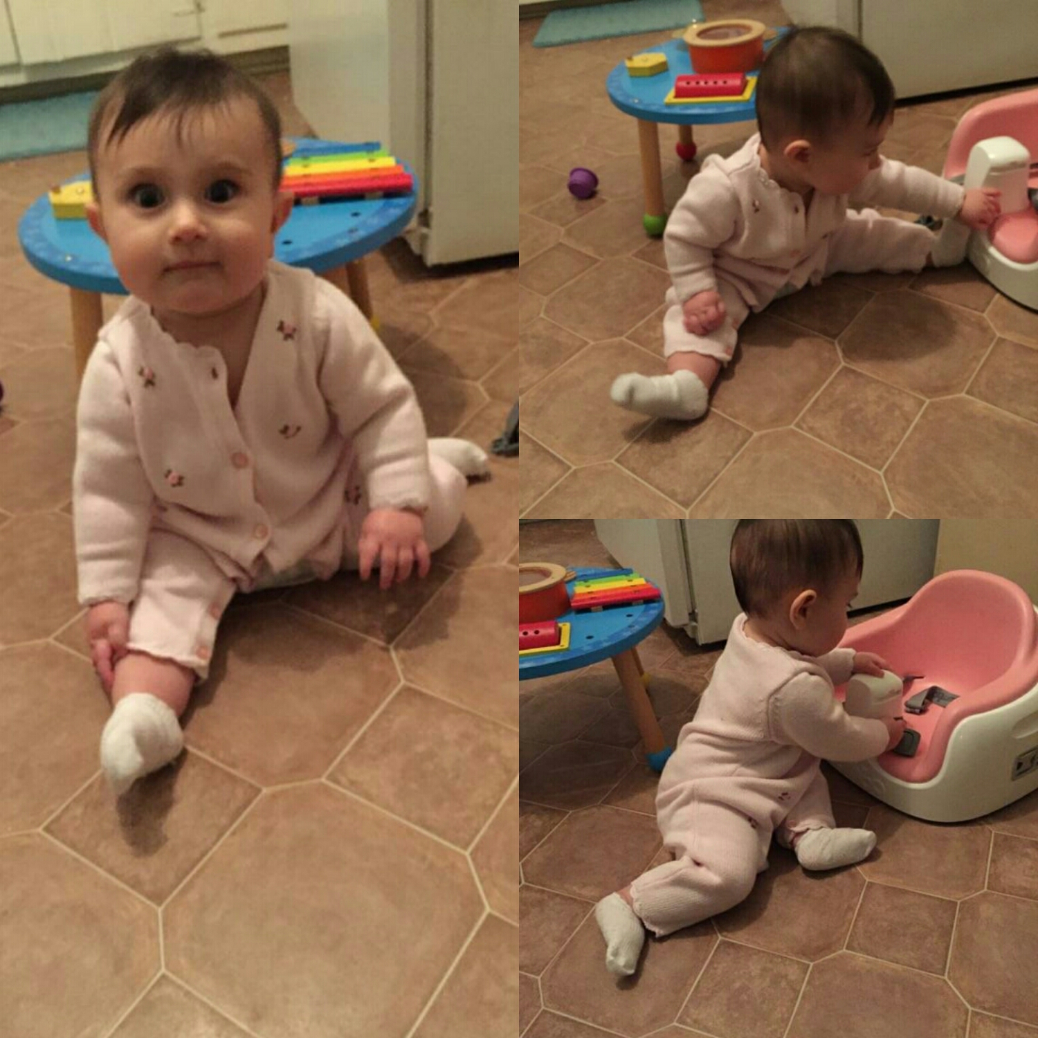 She is learning to crawl, but almost always keeps a leg a little in front of her so she can always get back to sitting, so she doesn’t get very far.