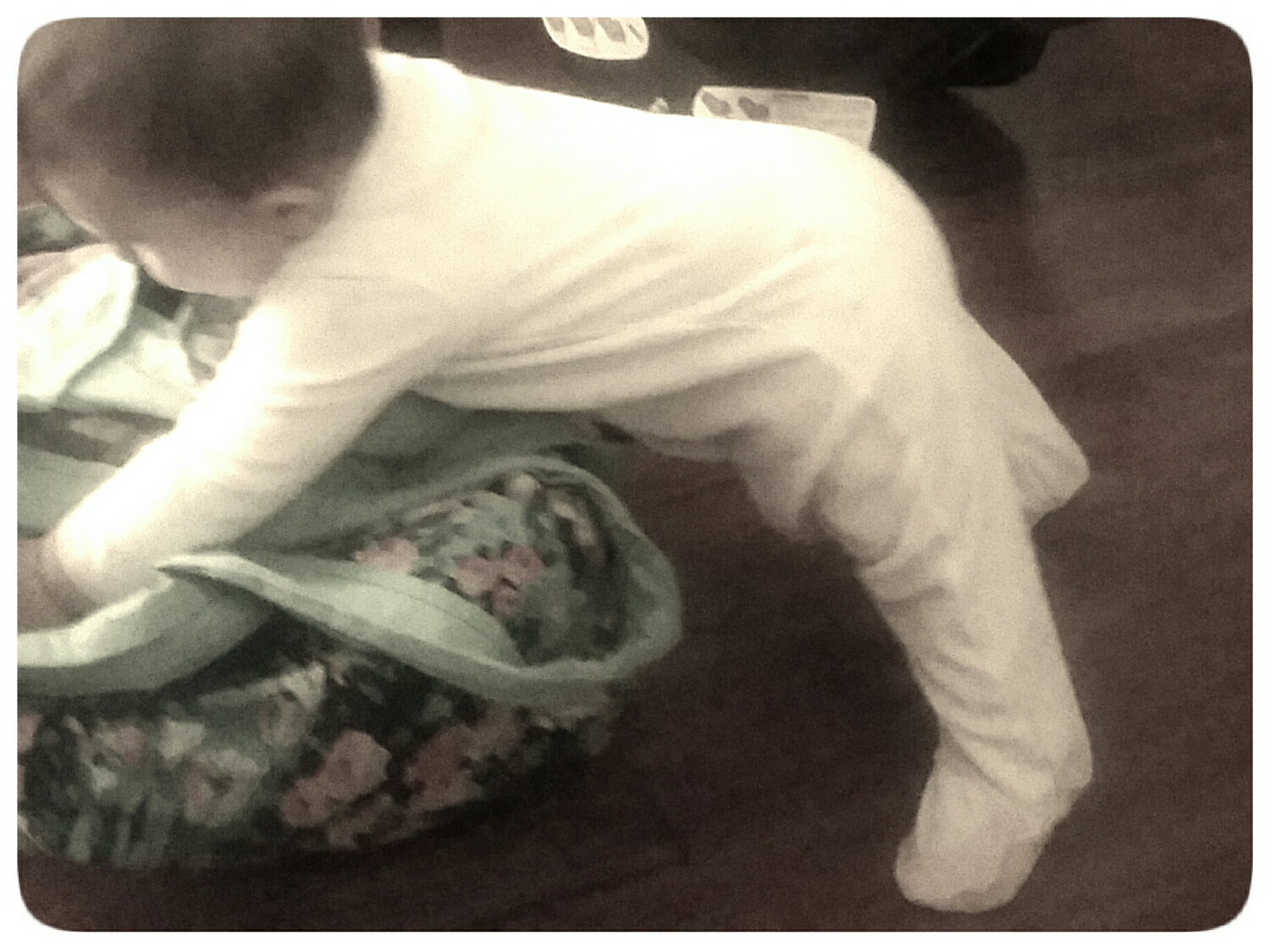 The bag was sliding out from under her hands, but at one point, she managed to use it to stand straight up. And then, of course, fell on her bottom. All day long, it’s stand, let go, plop.