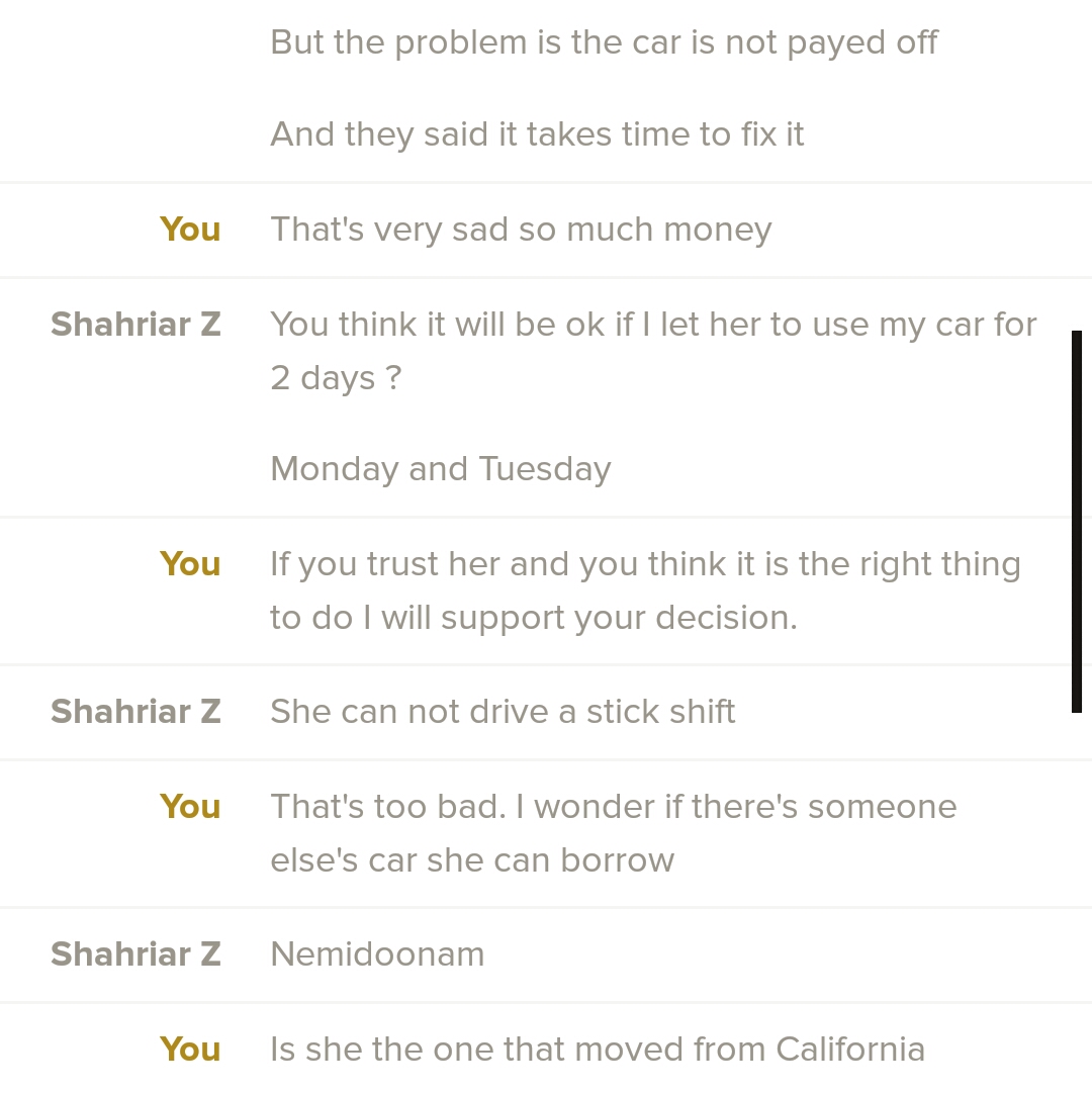 Yes he was generous. He wanted to let a lady he had only met a few weeks ago take his car for two days. But so often generous people or people with a servant’s heart, serve and give without including their family and sometimes even to the detriment of their families. Shah never did that.