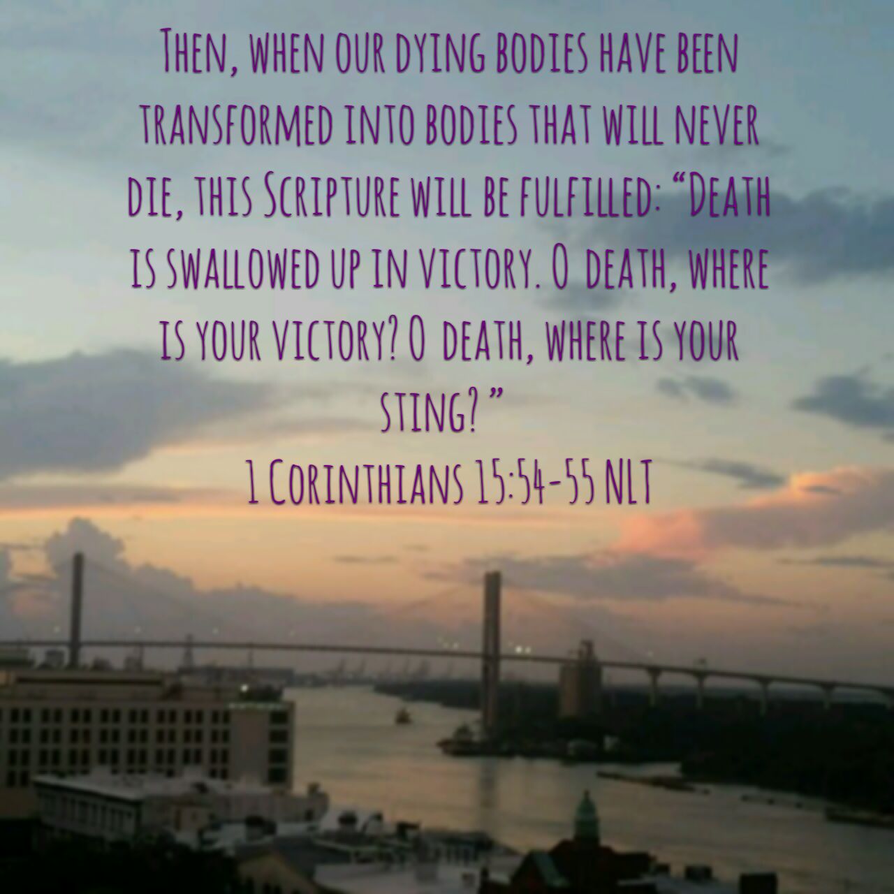 Then, when our dying bodies have been transformed into bodies that will never die, this Scripture will be fulfilled: “Death is swallowed up in victory. O death, where is your victory? O death, where is your sting? ”