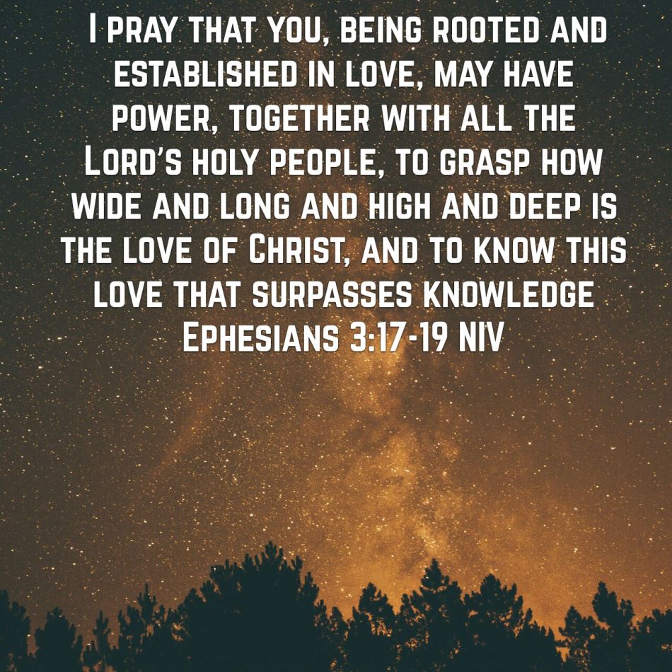 And I pray that you, being rooted and established in love, may have power, together with all the Lordʼs holy people, to grasp how wide and long and high and deep is the love of Christ, and to know this love that surpasses knowledge—that you may be filled to the measure of all the fullness of God.