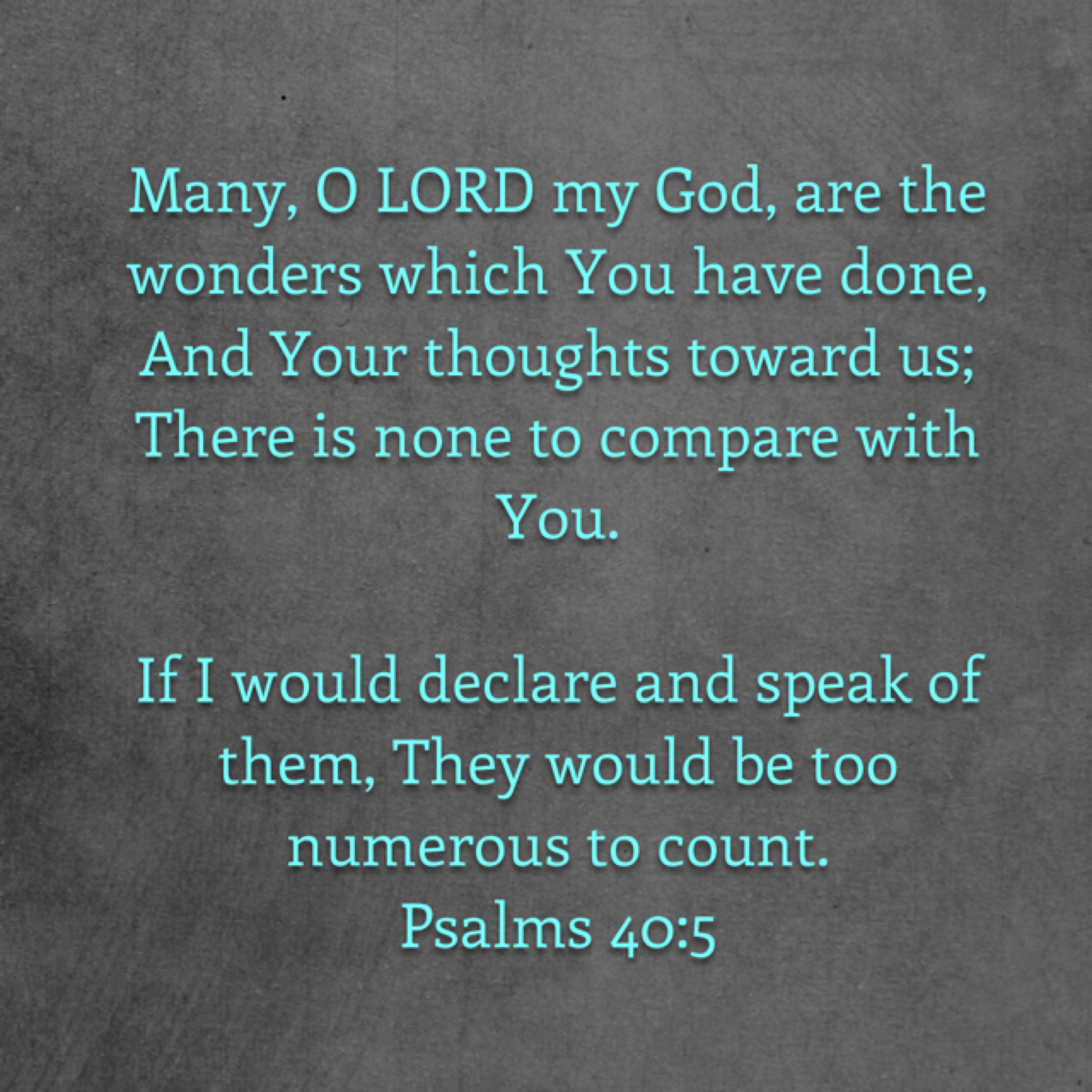 Despite the sorrow, the darkness, the evil, and the exhaustion, this is so true. God’s blessings are still too numerous to count or recount should I spend all my time blogging about this gifts and the blessings he provides. Psa 40